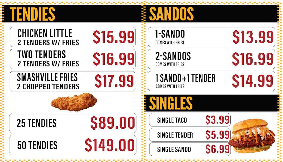 Tender Combos and Sandwiches: These include options like two-piece tender meals served with fries and single tenders or sandwiches also accompanied by fries. The sandwiches showcase chicken prepared in various heat intensities and are served on soft buns.